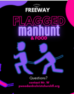 Be part of Flagged Manhunt on Sunday, May 17. We'll gather in the gym lobby at 6pm, do a little brainstorming then head to the pavilion area for a friendly competition. Questions? Contact Youth Ministry leader Mr. W.